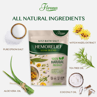 Fivona Sitz Bath Soak Blend consists 100% natural ingredients - Pure Epsom Salt, Witch Hazel Extract, Coconut Oil, Tea Tree Oil and Aloe Vera Oil. Free from synthetic fragrances, dyes, and harsh additives - just mother-nature ingredients to support relaxing and soothing soak routines.